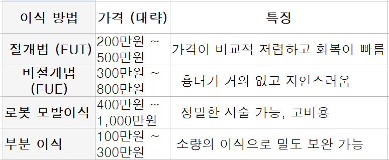 1️⃣ 모발이식 비용 범위 (한국 기준)